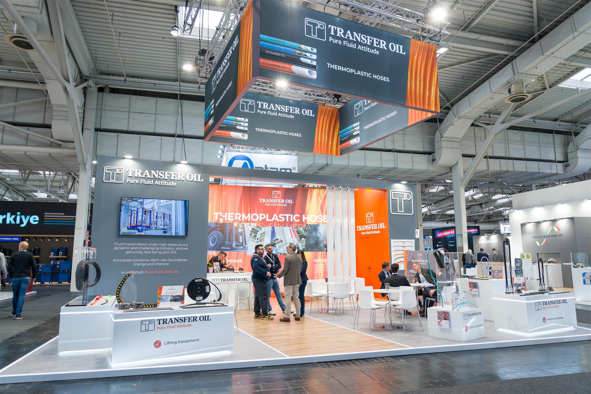 Un elemento distintivo della partecipazione di Transfer Oil a entrambe le fiere è stato l’introduzione di un nuovo concetto espositivo. Per la prima volta, i prodotti non sono stati presentati come semplici articoli a catalogo, ma inseriti in isole tematiche dedicate a specifici settori applicativi, con i tubi installati su attrezzature reali che ne mostrano l’utilizzo concreto. Dall’isola “Material Handling” con i tubi montati su pulegge e avvolgitori, fino all’area dedicata all’idro demolizione con una lancia equipaggiata con il nostro tubo ultra alta pressione 2263, questa nuova modalità di esposizione ha rappresentato un importante passo avanti nel raccontare le prestazioni e i vantaggi applicativi dei nostri prodotti, rendendo la visita allo stand un’esperienza più immersiva e coinvolgente.
